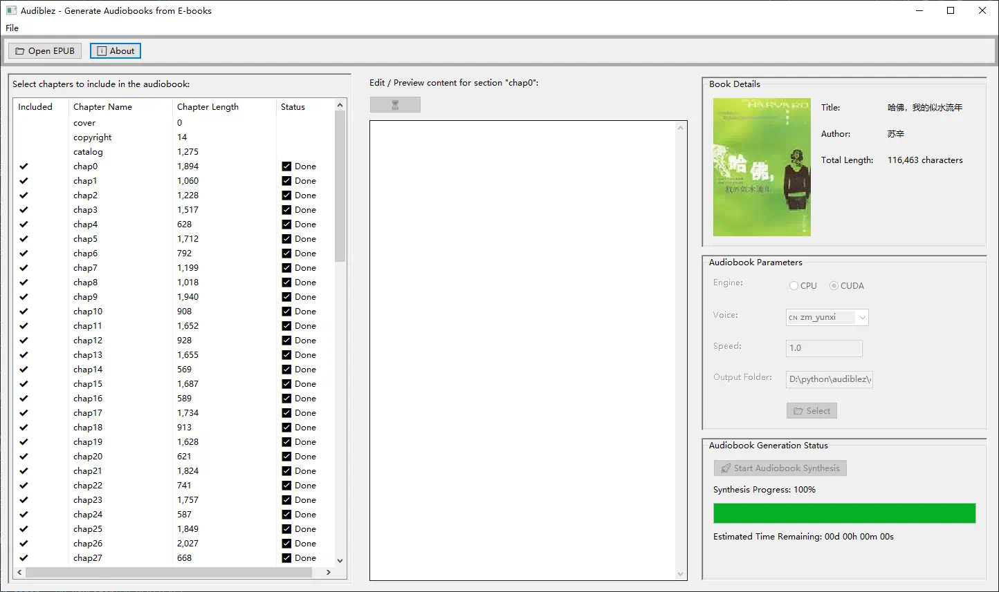 点击按钮Start Audiobook Synthesis,即可开始将文字转为语音,生成有声书,生成完成后会自动打开输出目录。