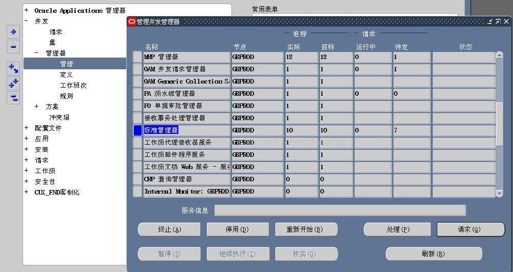 Oracle EBS服务器的操作系统是Linux 32位的,已经服役将近7年了尴尬。由于月底刚好要盘点,财务要求仓库不要采购接收入库,已经累积了二天的采购接收入库单据需要待入库的,第三天上午集中做采购接收入库,而采购接收入库是客制化开发的,为了方便用户批量接收入库,用户在短时间时提交57个采购接收入库请求,加上上午刚好需要给任务单批量发料和对物料事务处理的零成本设置了预警发邮件(占大多数)。导致大量请求等待运行,准标管理器(参考如下图)中堆累了2800多个请求在等待执行,所有用户提交的请求长时间等待。
