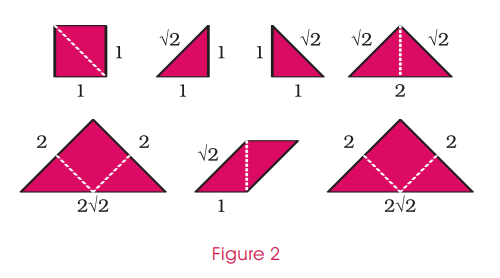 文章分享-七巧板拼凸多边形-PAUL SCOTT tangrams 老师让我们整一个七巧板的project,这里分享一篇七巧板拼凸多边形的文章,仅数学层面无代码实现部分。附上原文:The Australian Mathematics Teacher vol. 62 no. 2 (ed.gov)七巧板(Tangrams)问题:可以形成多少凸边形凸性定义:(1)无凹角(re-entrant angles)(2)图中的任意两点可以被完全在图里面的线相连。有理数和无理数(Rational and irrational)边长分为两种:有理数(1,2),无理数(.