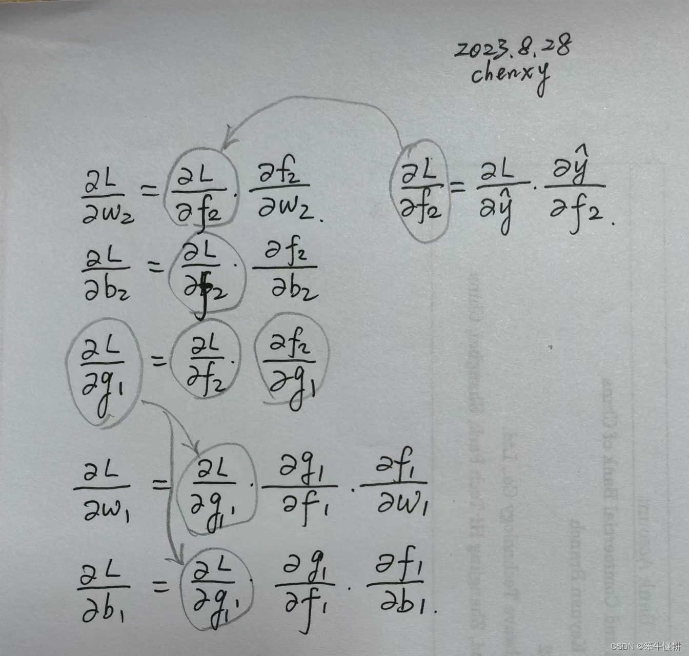 L针对g1的梯度在计算w2和b2的梯度时并不需要,但是在计算前一层的w1和b1的梯度(注意,这里为了简介,说“w1的梯度”实际上意思是L针对w1的梯度,余者类推)需要用到L关于g1的梯度。