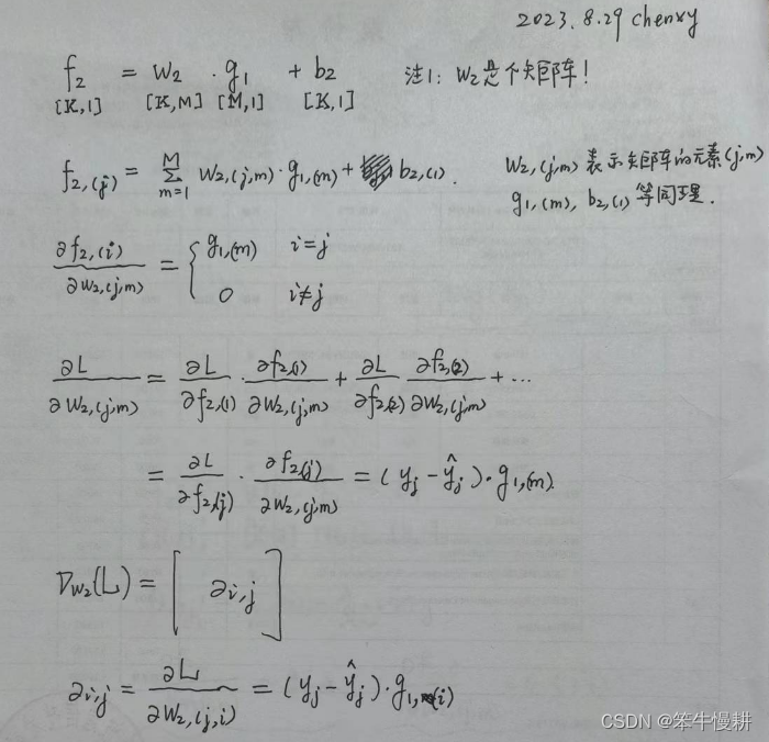 基于(5-1)和(5-2)接下来求L对w2的梯度表达式。向量/矩阵微积分虽然最后结果写出来非常简洁,但是实际上并不是像单变量微积分那样直观。保险的做法是分解为各分量,通过链式法则计算,然后再拼成向量(或矩阵)表达形式。除非你对向量(矩阵)微积分的运算跟对四则运算那样捻熟于心。具体推导过程如下所示(以下如果没有特别提起,缺省的都是矩阵乘法):
