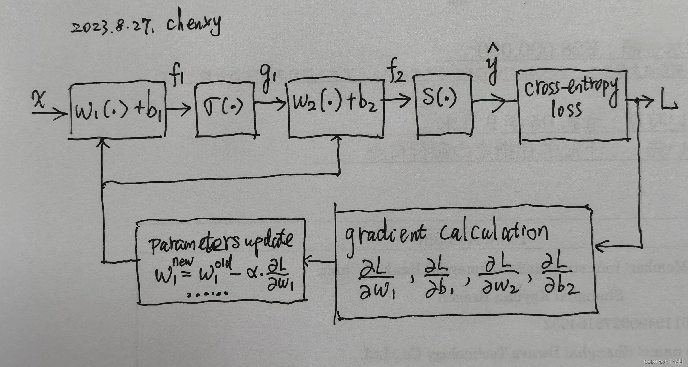 图1所示的三层神经网络(关于神经网络的层数,不同的作者可能有不同的看法。有些人把输入层计入层数,有些则不计入。上文中当我们说单层神经网络时其实就不把输入层当作一层计数。这里说三层就是把输入层计入了。有点乱,不过无所谓了。。。你懂就行)的基于梯度下降进行训练优化的计算框图如上图所示。其中S()表示softmax函数。