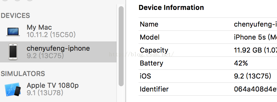 把手机连上电脑,然后打开Xcode,选择Window-->Devices,就会显示出当前你连接上的所有设备,其中显示的Identifier就是该设备的UDID: