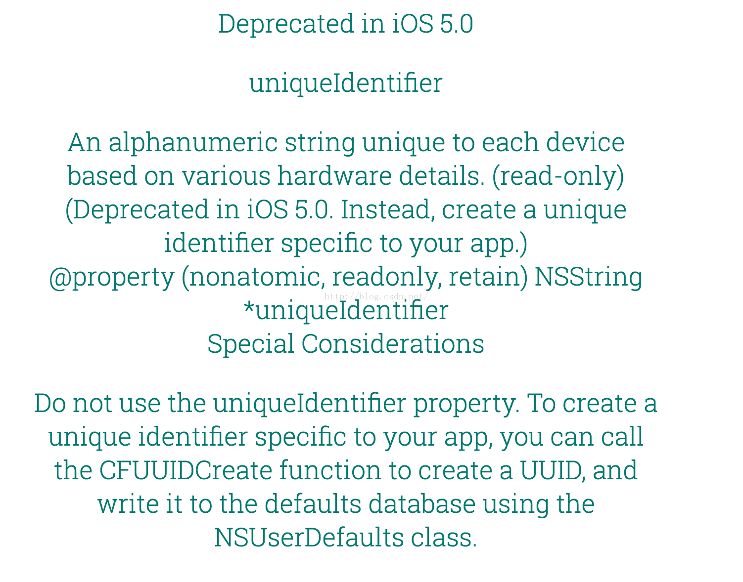 NSLog(@"uuid 1 = %@",uuid.UUIDString);此时打印出的字符串UUIDString这个东西不是真正的UDID,而是一个有一点像的替代品。如同我上面所说,UDID是只和iOS设备有关的,而这个identifierForVendor是应用和设备两者都有关的,A应用安装到张三这台设备上,就会产生一个identifierForVendor(比如是:1234);A应用安装到李四这台设备上,就会产生另一个identifierForVendor(比如是:5678);B应用安装到张三这台设备上,又是一个全新的identifierForVendor(比如是:9999),B应用安装到李四这台设备上,还是一个全新的identifierForVendor(比如是:7777)。但是无论A应用安装卸载多少次,产生的是都是1234. 所以我们知道,这个identifierForVendor是一种应用加设备绑定产生的标识符,相当于是:Z(identifierForVendor) = X(某应用) + Y(某设备)。 当然,和真正的UDID的区别是显而易见的:也就是说App的开发者没有办法去区分某一台设备了,而是只能识别某个应用在某台设备上。