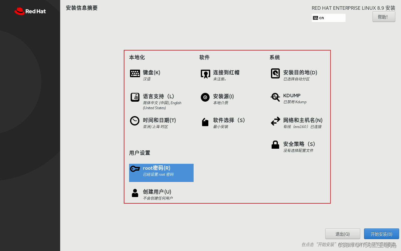 建议安装时就进行配置或确认如图所示的7处框选项,其余配置项保持默认即可。