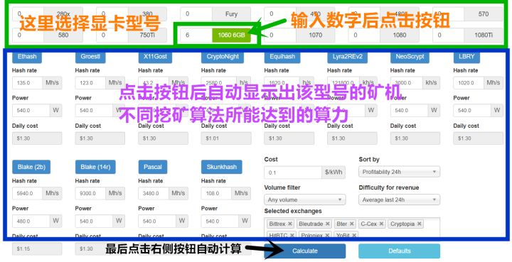 第二步:输入关键信息,比如你想知道一台6卡1060 6G的矿机挖哪个币收益最高,就在对应的框内输入数字“6”,并点亮按钮。如图所示: