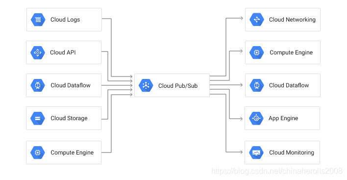 整个GCP的Stack可以相互集成,其它组件如Pubsub集成如下: