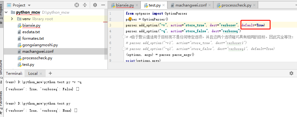 添加-q参数,多了一组键值对,命令行加上-q值是假,不加也就是默认是真。(自解:可用于某个功能或其它是否开启或其他并给出python教程默认状态)