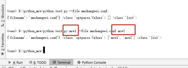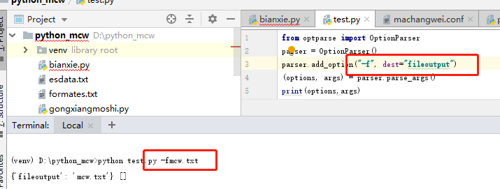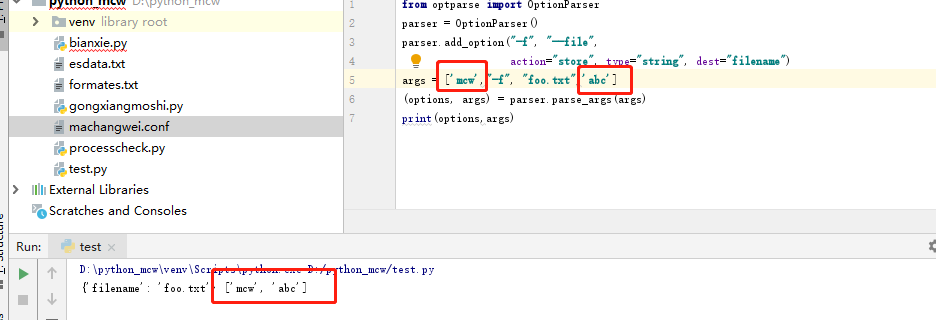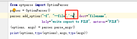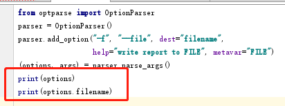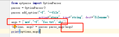 终端上效果一致的传参,不用创建列表,将列表传进去,貌似argv[1:]的参数就是一个列表,默认传递到parse_args方法中,遇到定义的-f之类的,就会将后面那个值存到dest中,作为定义的dest的值,而其它没用add_option的就传到args列表中