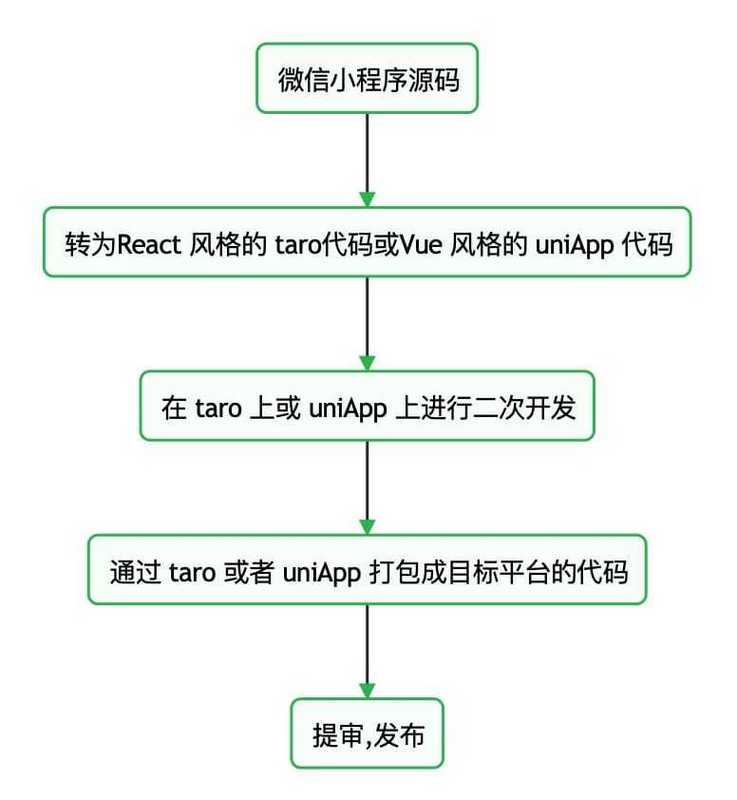 | taro | 京东出品,一种类react的语法的小程序开发框架,支持一套代码转为微信小程序,H5,百度小程序,支付宝小程序,快应用,ReactNative,字节跳动小程序,QQ 轻应用.可以看到功能还是很强大的,并且支持将原生开发的微信小程序转为taro小程序 | react | https://taro.aotu.io/ | | uniApp | 也是宣称一套代码打包为不同平台的东西,是一种类vue语法的实现.文档没有taro写得好,目前社区也没有其他框架成熟.了解不是很多,这里就不在赘述了 | vue | https://uniapp.dcloud.io/ | | wx2bat | 自己开发,使用最简单的一个工具,它主要做的事情:将 wxml 后缀名改为 ttml,将 wxss 后缀名改为 ttss,将 wxml 中 wx: 改为 tt,将 js 中 wx: 改为 tt:.同时支持转为百度小程序,支付宝小程序 | 各个平台的原生语法 | https://www.npmjs.com/package/wx2bat |