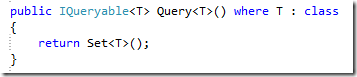 请注意Query<T>()方法,这个方法返回一个IQueryable<T>的对象,而实现了IQueryable的对象是支持LINQ操作的,也就是说,我们可以仍然可以将搜索的Expression交给真正的DbContext来做,而这个DbContext只需要简单一句话: