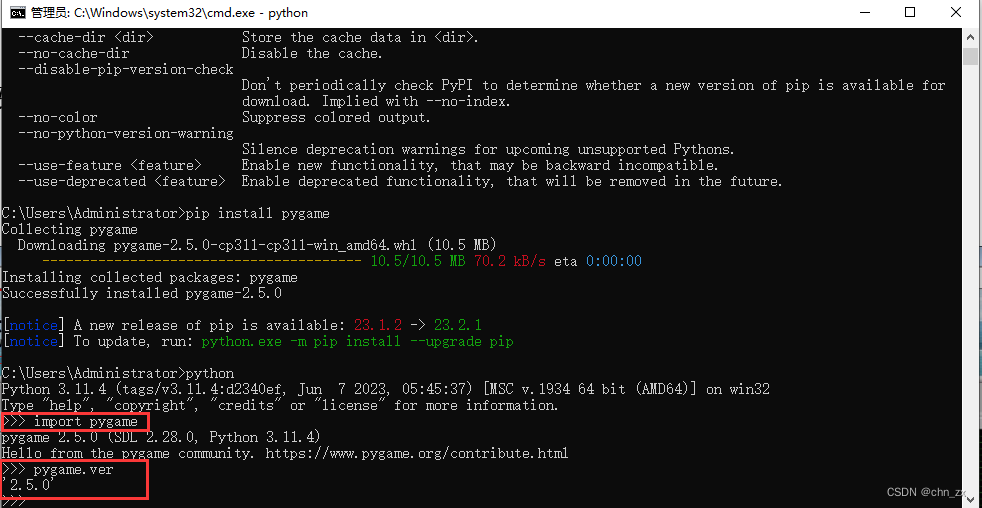 打开cmd,直接输入pip install pygame,电脑会自动下载最新的pygame并自动安装,下载安装完成后的提示如下: