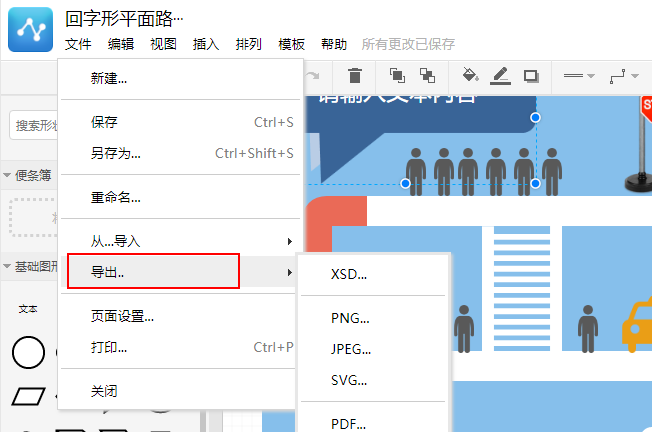 6.这时就可以将制作完成的流程图导出桌面进行使用了 ,点击文件选项中的导出栏目,里面有很多导出格式可以进行选择。