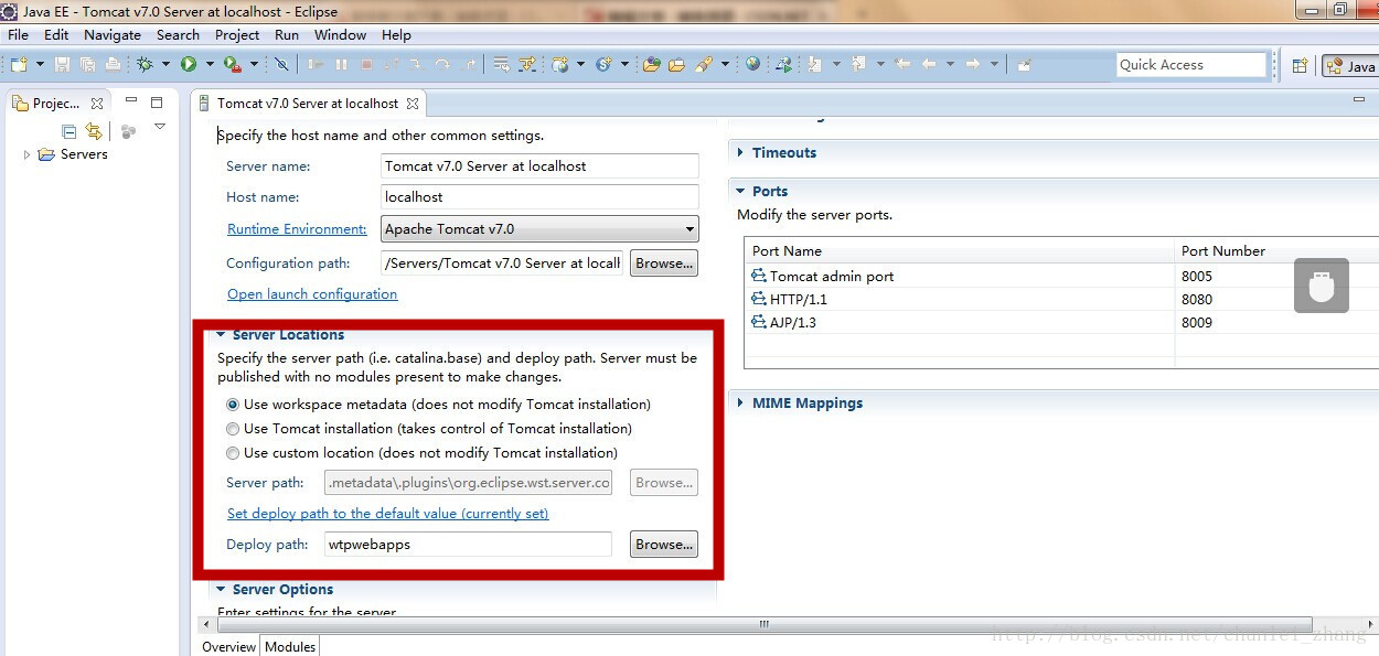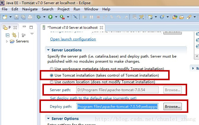 三)对上面全红的进行修改,既Server Locations进行修改,选择第二项:User Tomcat installation(takes control of tomcat instatllation) 。Server path不需要修改,Deploy path :设置成你本地的tomcat的webapp目录即可,如我的tomcat是在D盘,所以设置的结果如下: