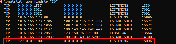 如果配置的是80端口,打开cmd, 输入命令:netstat -aon|findstr "80",回车,记下最后一位数字,即PID,这里是15096。