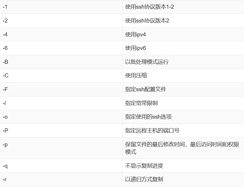 scp scp(secure copy)是一个基于SSH协议在网络之间进行安全传输的命令,其格式为“ scp [参数] 本地文件 远程帐户@远程IP地址:远程目录 ”。