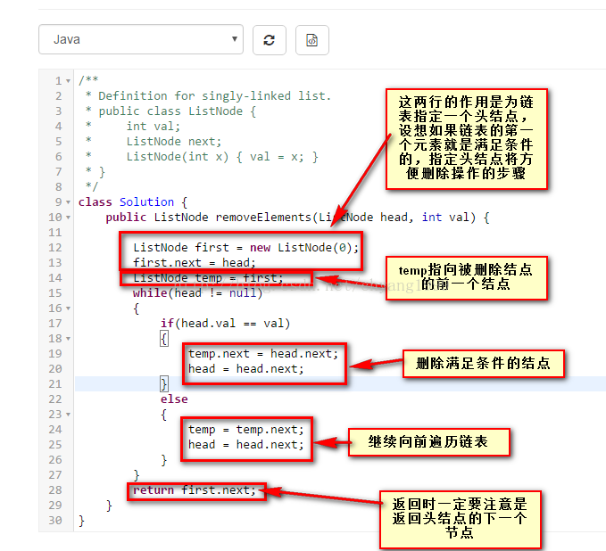 这个题目让人想到的第一个解法就是遍历链表一一比较来删除值等于val的元素。