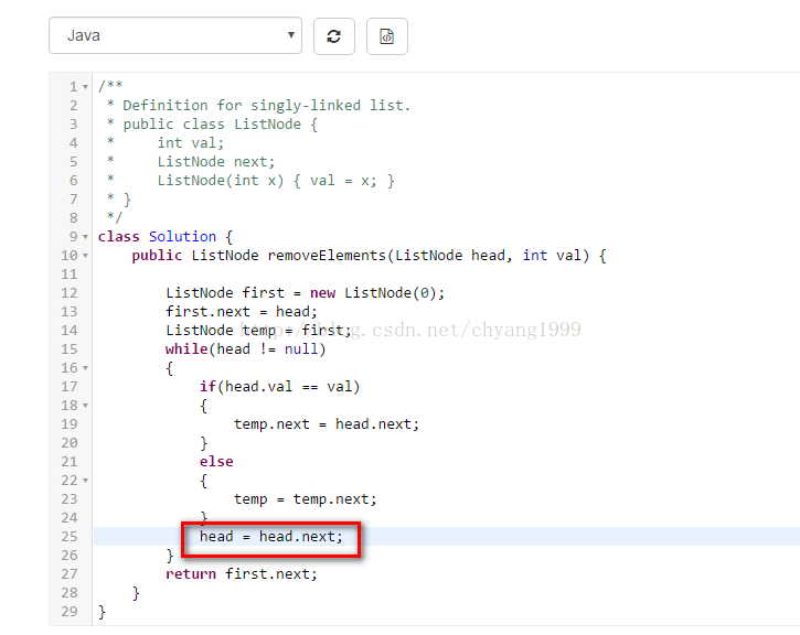 思考了很久,也没有发现更快的方法,而且上述方法的时间复杂度为O(n),已经是很低了,但是我发现自己第一次提交的代码重复代码太多了,head = head.next应该转移到判断语句之外,因为无论条件满不满足,都是要继续往前走的,所以我修改了一下这行代码的位置