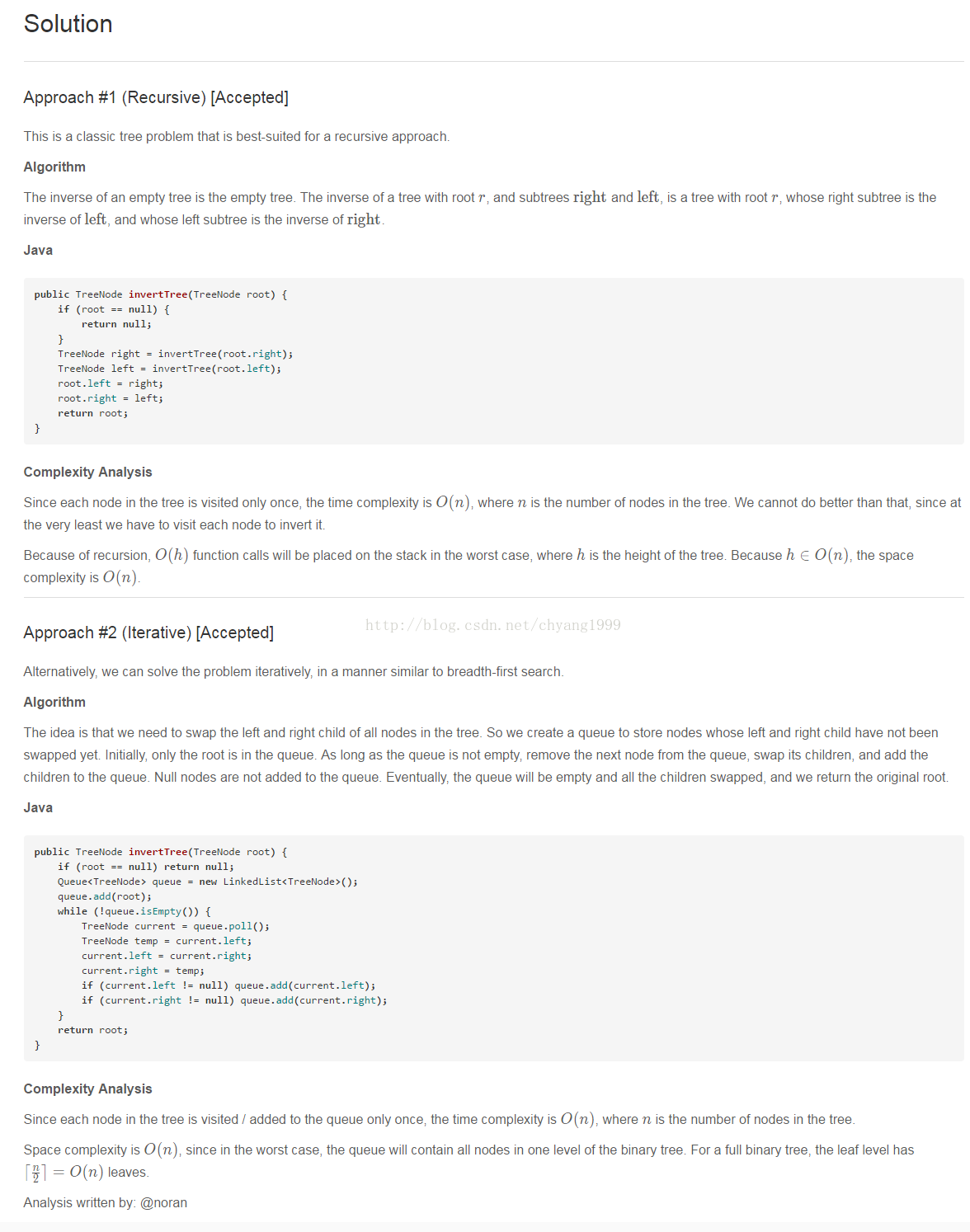 关于树的问题用递归的思想来做肯定是没有问题的,我第一个解法也就是递归的方法,这里我就不再介绍我的解法了,我们看一下leetcode上给出的详细介绍。