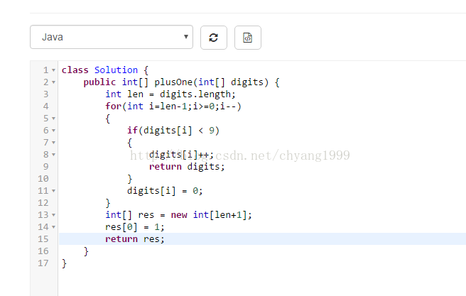 这道题最直观的解法是逆向遍历数组,同时处理进位,如果最后一位仍然有进位,则直接在数组的最前面插入1.时间复杂度为O(n),空间复杂度为O(1)。