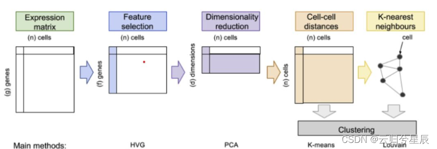 【图中不同的颜色表示对第一步得到的表达矩阵进行的不同处理,例如第二个蓝色框"feature selection"是从原始表达矩阵中删除行,方法有HVG、M3Drop、Spike-in;再往下"dimensionality reduction "目的是降维,会计算出一个新的包含meta-features的矩阵,可以想象成把细胞分类,相似的群体汇集到一起有共同的meta元信息,方法如:PCA、tSNE、Diffusion map;接下来是聚类"Clustering",包括计算细胞与细胞之间的聚类,如K-means、DBSCAN;或是"K近邻算法",如Louvain、infomap、densityCut、SNN-cliq】