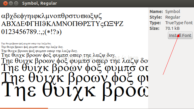 (使用-d可以选择解压到某个文件夹),解压后得到几个.tty字体文件,wps官网上说要把这些字体文件放到~/.fonts文件夹中,但是为找了半天没有发现这个文件夹,后来我直接在~目录下新建了一个fonts文件夹,把.tty字体放到了这里。(我后面成功了,由此推测,字体文件不一定要放在~/.fonts文件夹,应该哪里都可以,但是要安装!)注意:这样还没完,记得双击.tty文件,然后点击右上角的install font使其变为灰色表示安装字体成功。