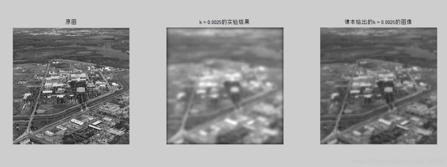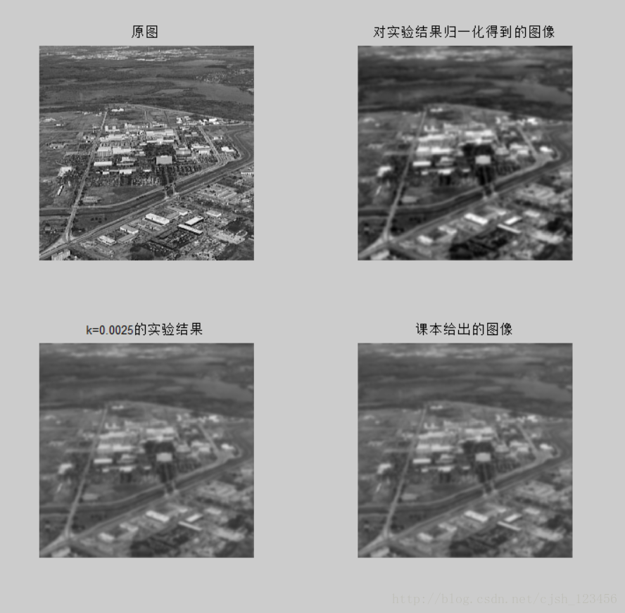 这个问题困扰了我很久,我尝试了各种不同的方法,在不中心变换的情况下进行滤波,发现情况更加糟糕。后来在做后面运动模糊模型的时候,得到的结果也与课本的结果相差甚远。之后,在尝试了不对图像进行填充(即不对原图像填充0值至大小为[2m, 2n]),发现得到的结果与课本的一致。对得到的结果图像直接取整(若是在最开始将值归一化到[0,1],自然不需要取整这一步),没有归一化到[0, 255]则与课本的结果一致。代码执行结果如下(同样是k = 0.0025的情况):