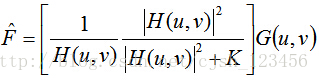 一个维纳滤波的计算公式如下,其中K是一个特定的常数,与噪声和未退化图像之间的信噪比有关。不同情况下取值不同。在平均意义下是最优的。