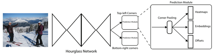 图像进入backbone网络(Stacked Hourglass Networks),内含两个沙漏模块,然后分成两路,一路进入Top-left Corners,这一整个模块要先经过Corner Pooling后有三个输出,Heatmaps、Embeddings和Offsets。另一路进入Bottom-right Corners,也和Top-left Corners类似。