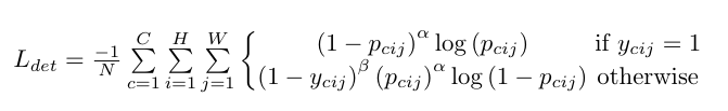 其中,𝑝𝑐𝑖𝑗表示预测热点图上对应位置的分类得分,𝑁表示图像上的目标数量。该损失函数在focal loss的基础上使用(1−𝑦𝑐𝑖𝑗)𝛽项来减轻真值临近点的损失值。