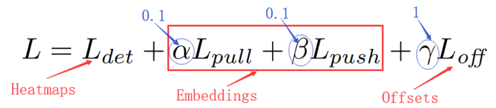 Embeddings:将角点配对,Heatmaps中的预测角点都是独立的,而一个物体需要一对角点,如果一个左上角点和一个右下角点属于一个目标,那么它们的embedding vector之间的距离应该很小。因此Embeddings分支负责将左上角点的分支与右下角点的分支进行匹配,找到属于同一个物体的角点,完成检测任务,其大小为1×W×H。就是根据vector的距离去匹配。