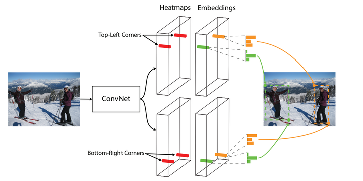 图像输入后经过一个ConvNet,然后再进入Top-Left Corners和Bottom-Right Corners,同时输出Heatmaps和Embeddings。Heatmaps的作用是预测所有左上角点和右下角点的位置,Embeddings的作用是将属于同一目标的两个角点配对。