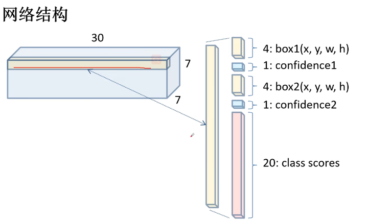 因此,每个网格预测2个bounding box,每个bounding box有5个参数,再加上VOC数据集有20个类别,一共是预测30个参数。