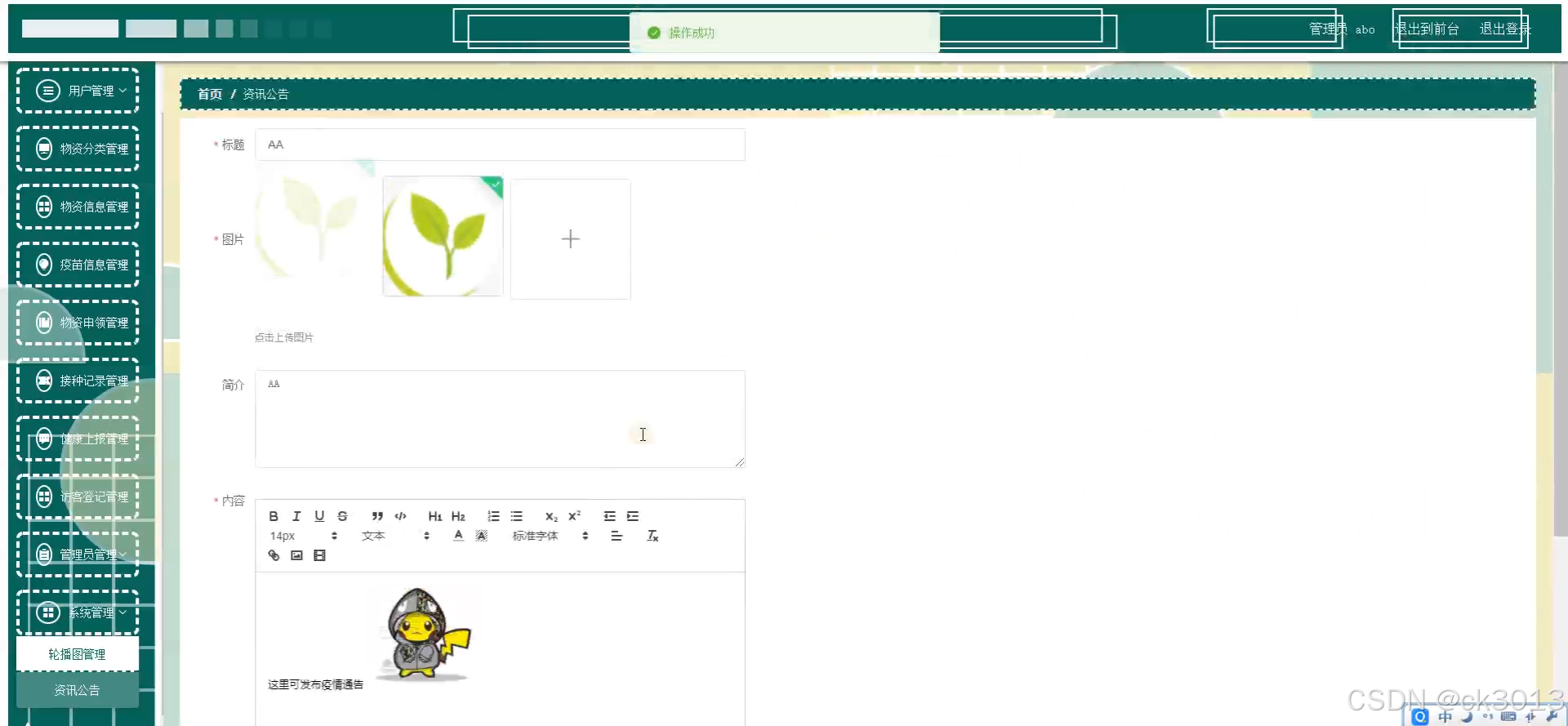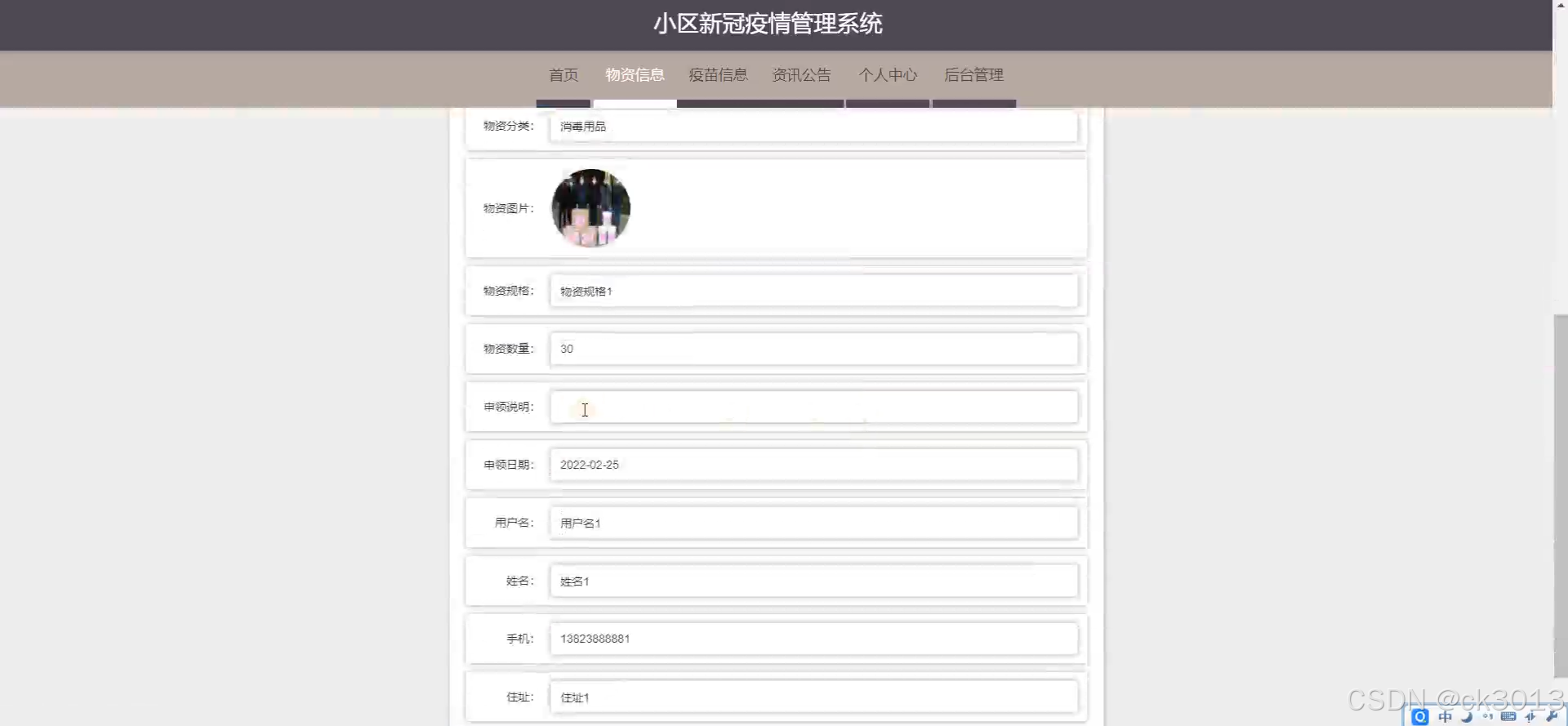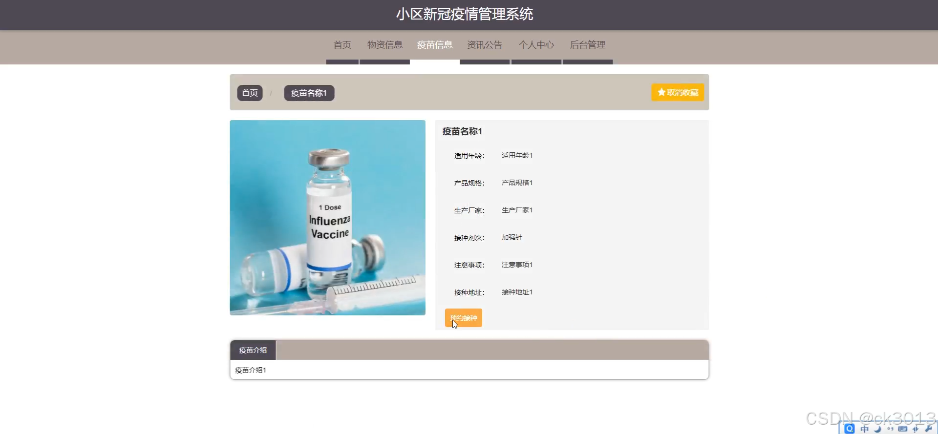 - 功能模块开发:实现用户管理、物资管理、疫苗信息管理、健康上报、访客登记等核心功能。