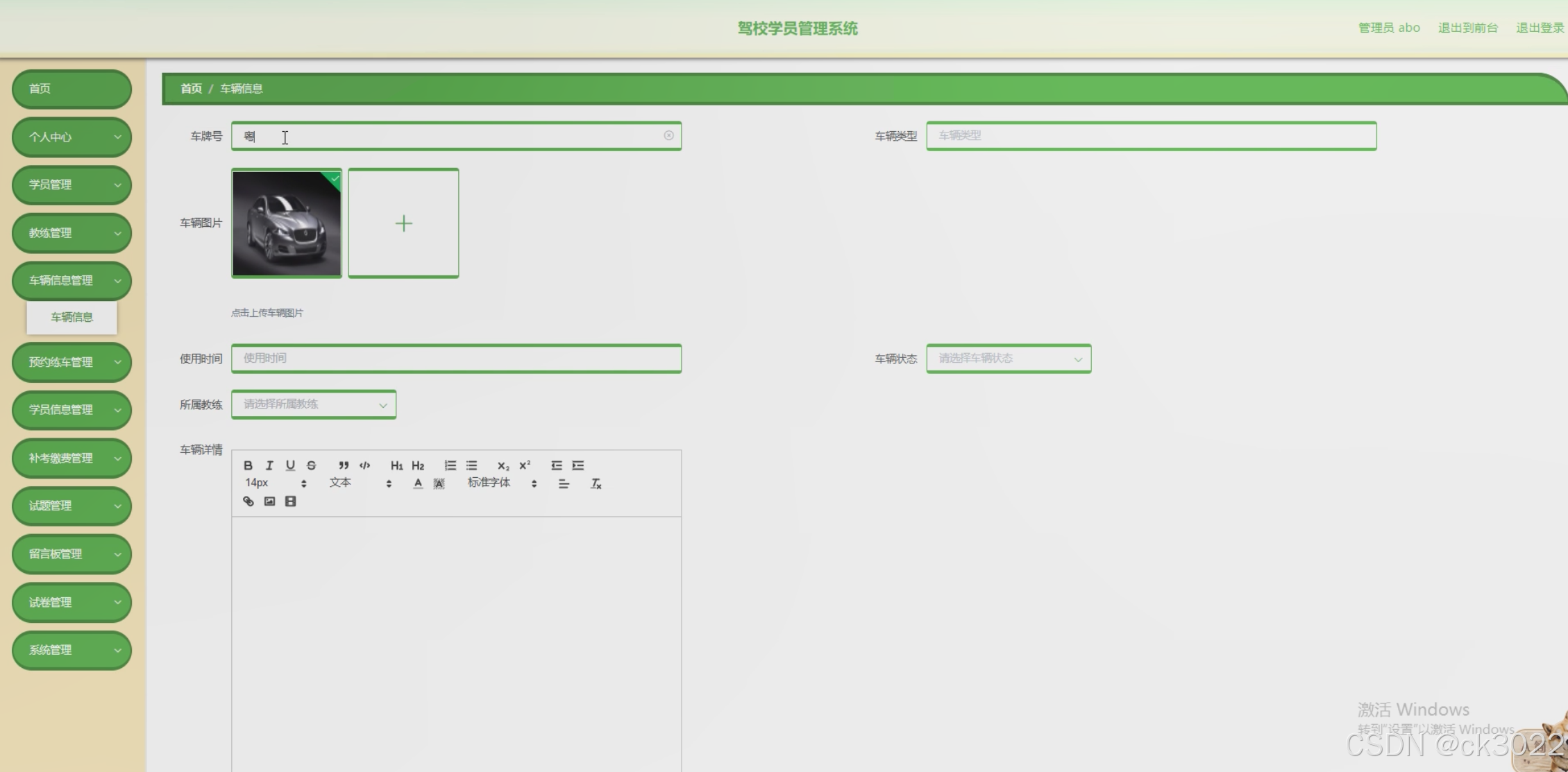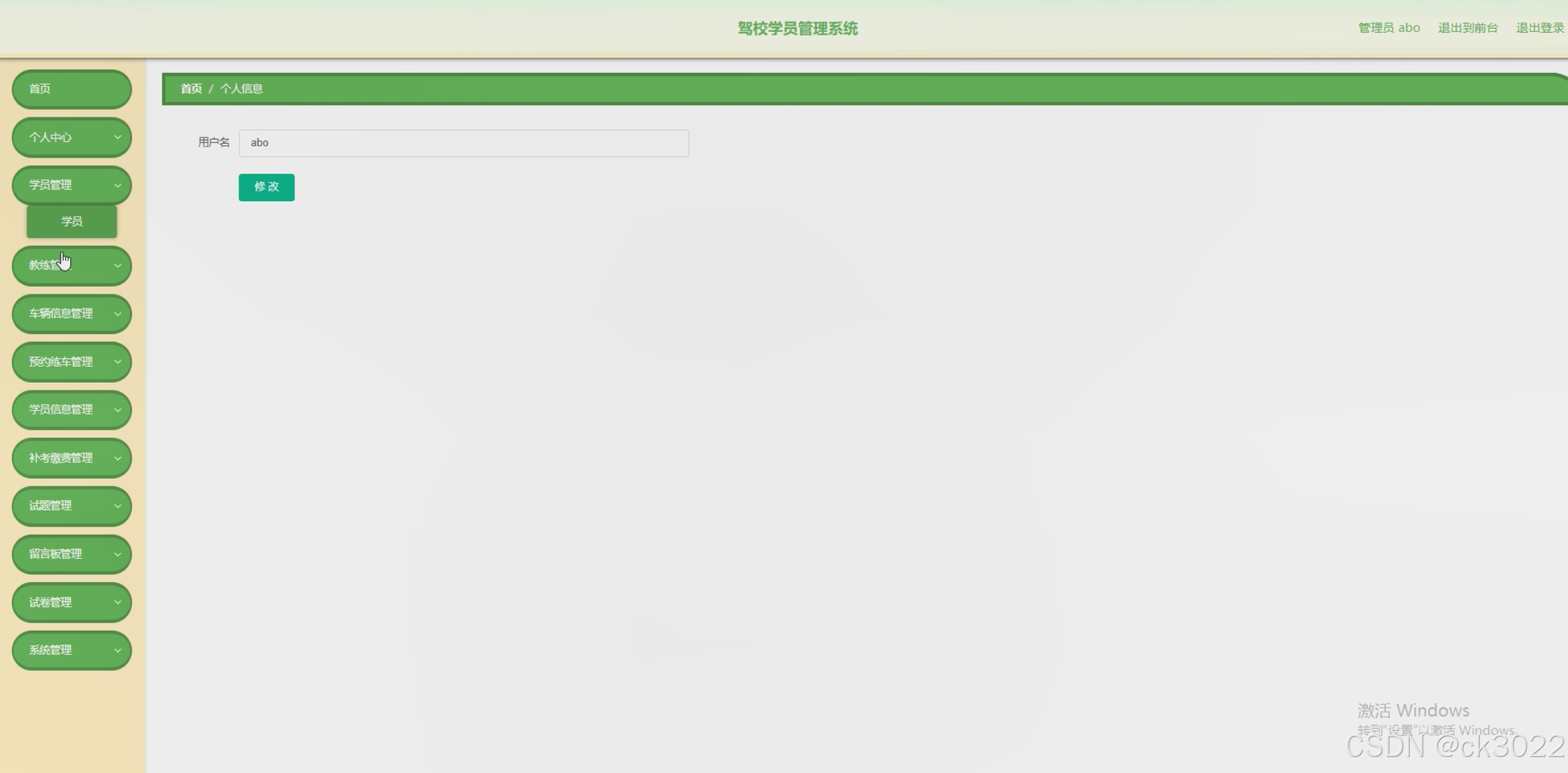 本项目旨在运用 Springboot 框架构建一套完善的驾校学员管理系统。为学员与教练打造一体化管理平台。学员通过系统可轻松注册登录,便捷查看和完善自身学员信息,包括个人基本资料、学习进度、考试成绩等。预约练车模块方便学员根据自身时间在线选择练车时段,系统自动匹配教练与可用车辆,并及时反馈预约结果,学员可实时跟踪练车安排。当学员需要补考时,补考缴费模块清晰展示缴费金额、方式、截止时间等信息,学员可在线完成缴费操作,系统自动记录缴费状态。