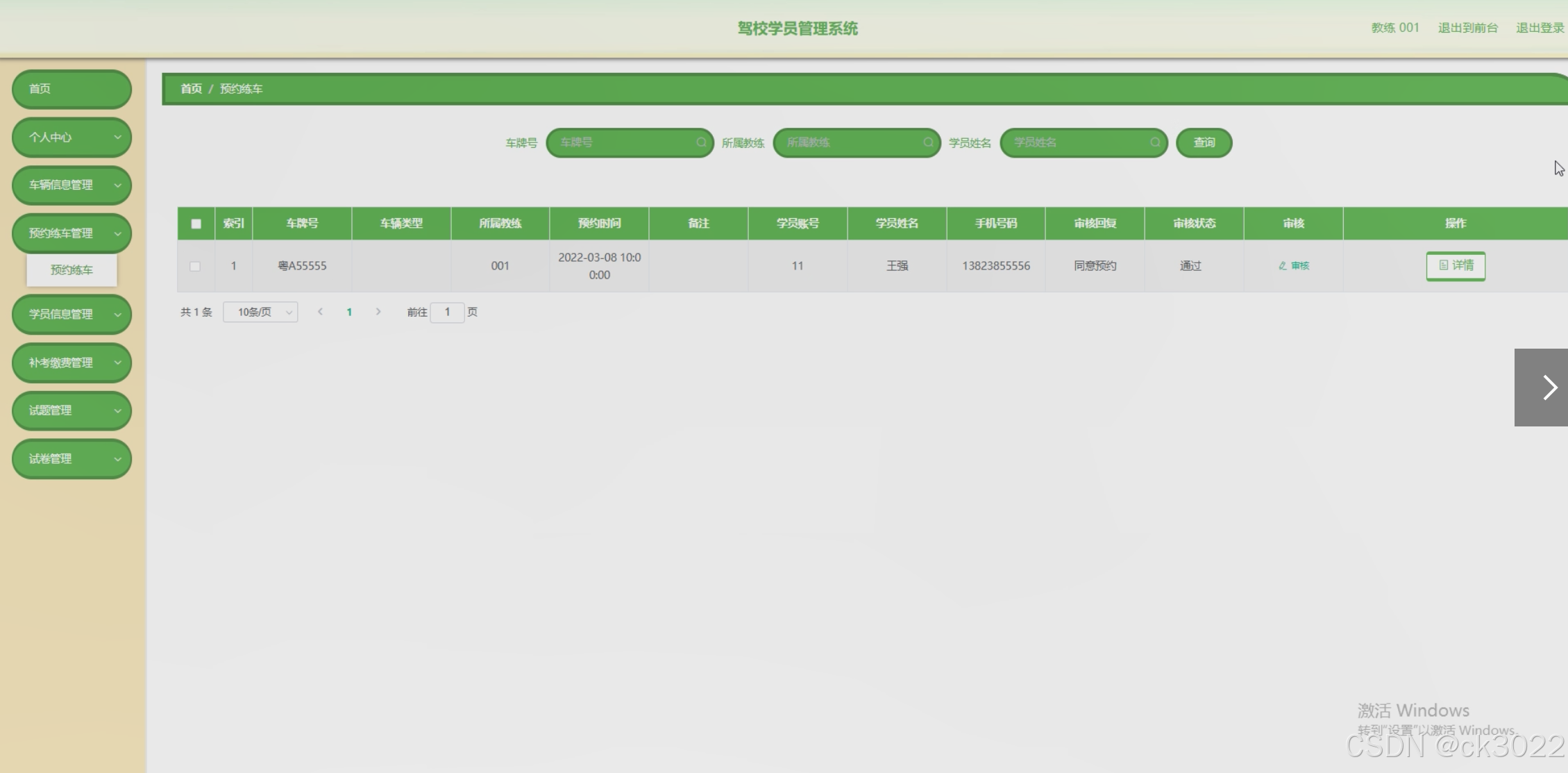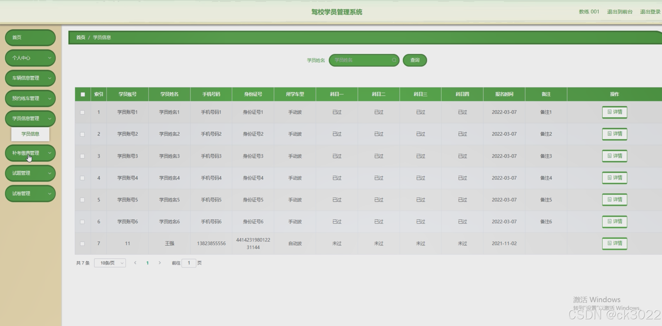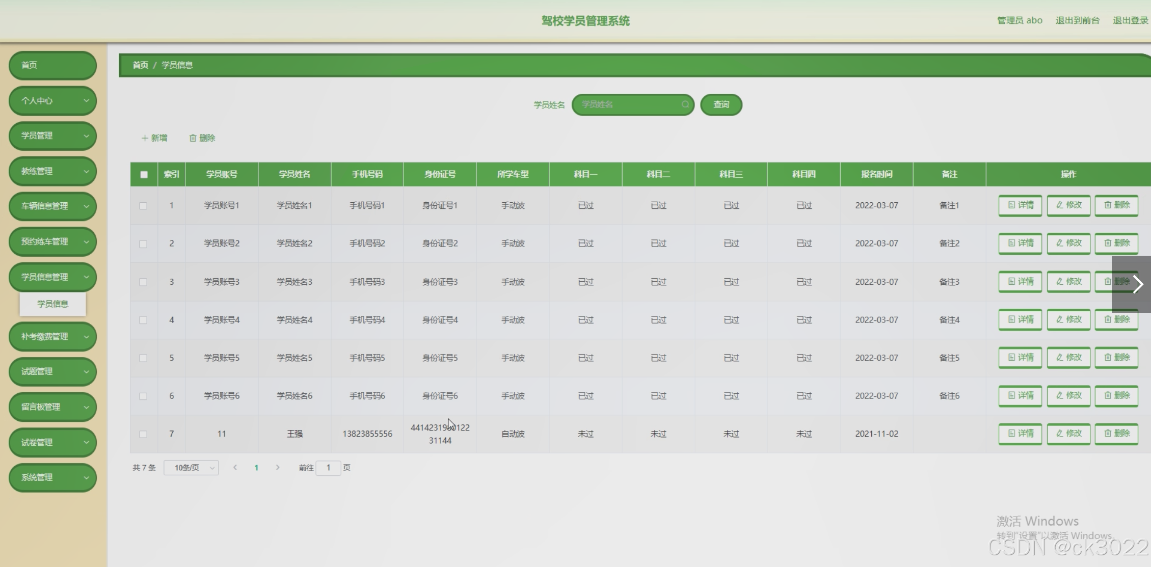 - 成功开发基于 Springboot 的驾校学员管理系统,实现驾校学员管理业务高效运行与学员便捷使用,显著提升驾校学员管理系统的运行效率与管理水平。为学员提供优质的学习管理平台,为教练创造良好的工作环境。