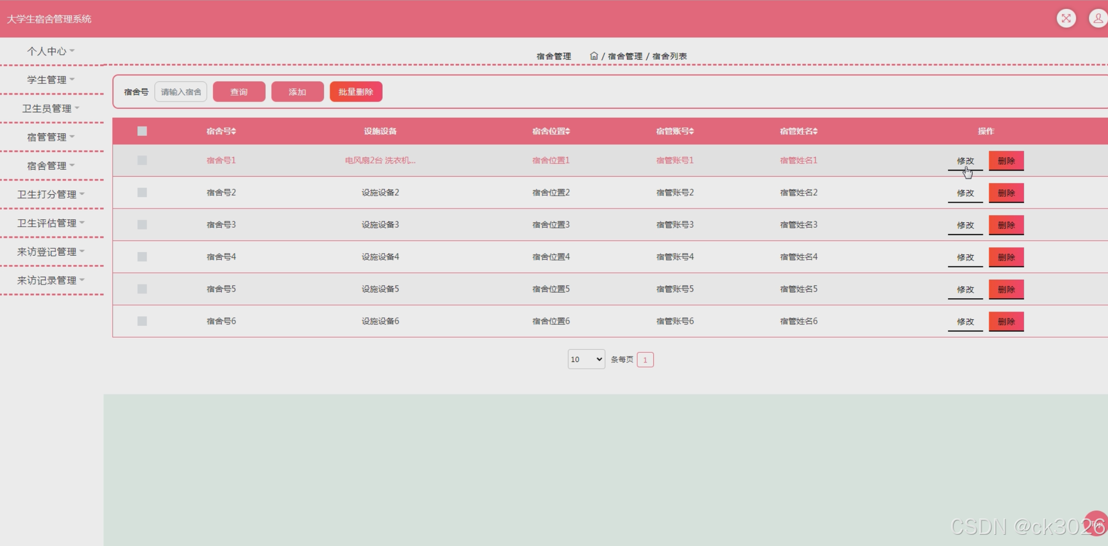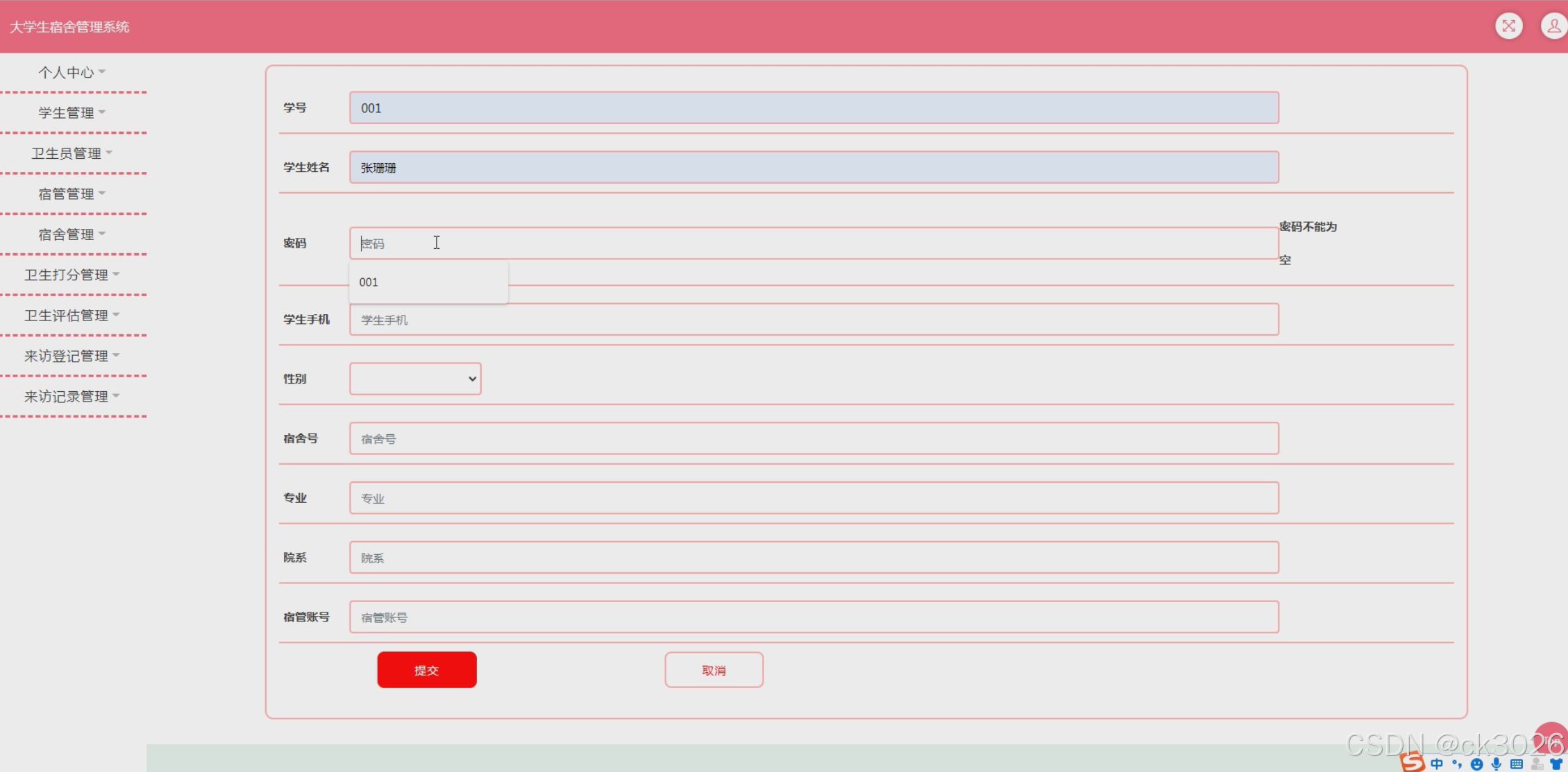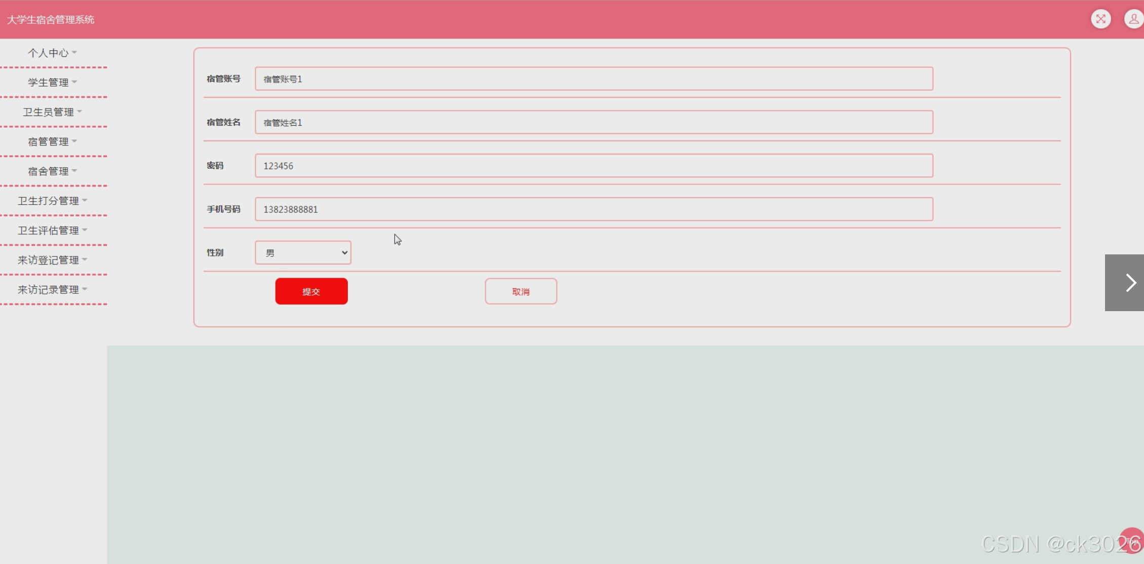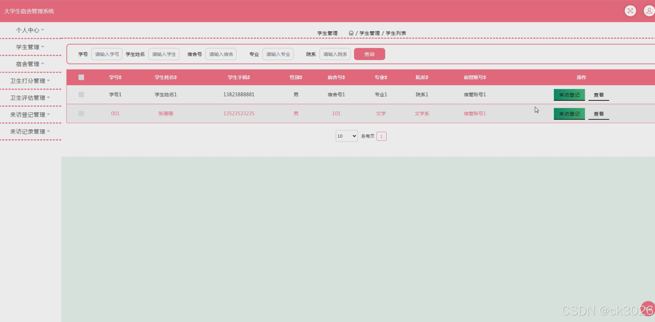 用户管理模块:系统支持学生、宿管、卫生员等多角色用户的注册、登录与信息管理。不同角色拥有不同的权限,确保数据的安全性和管理的有序性。