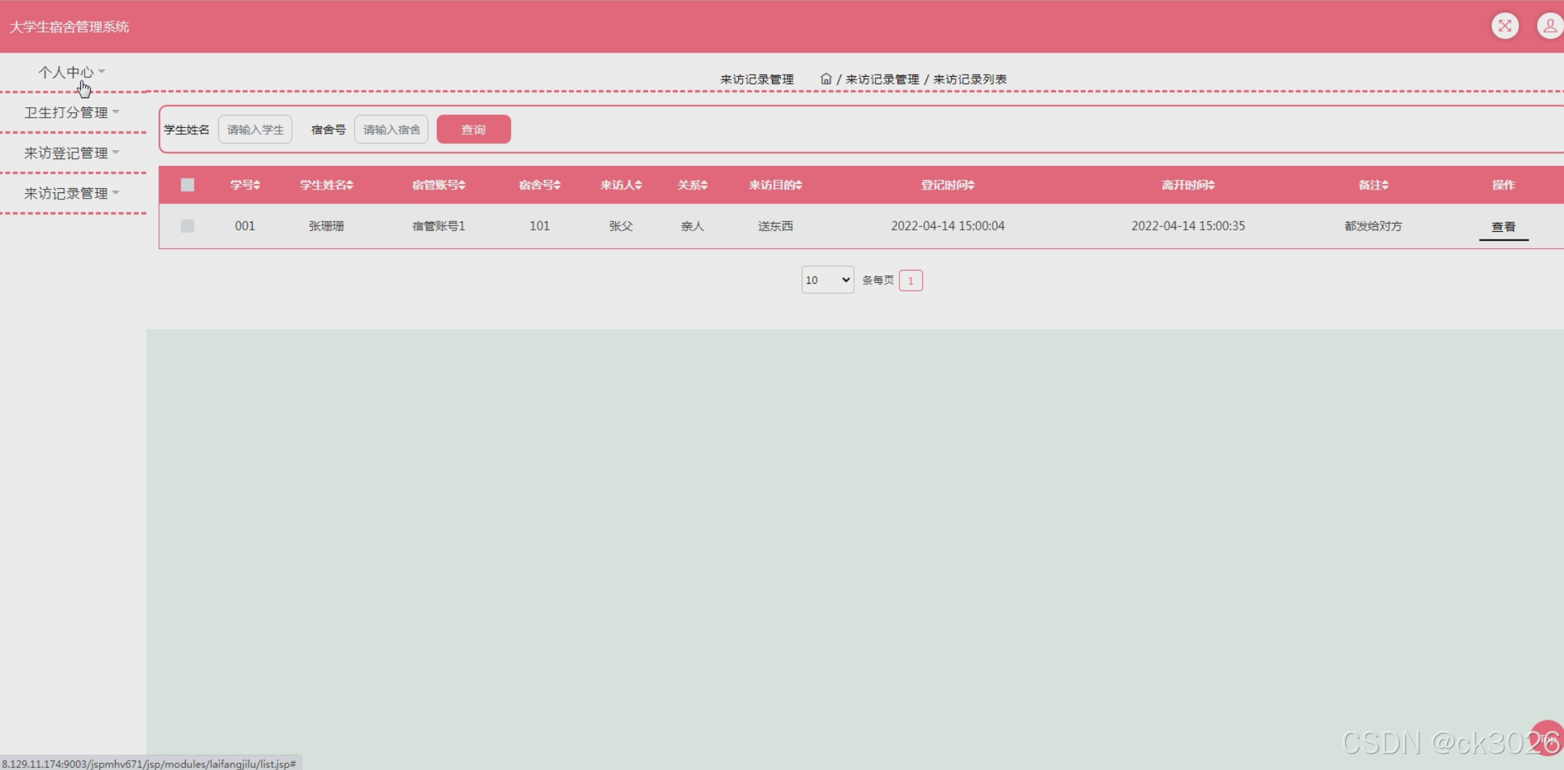 来访登记与记录模块:为加强宿舍安全管理,系统提供来访登记功能。外来人员需通过系统登记个人信息、来访目的及被访学生信息,经宿管审核后方可进入宿舍。系统记录所有来访记录,便于查询和追溯。