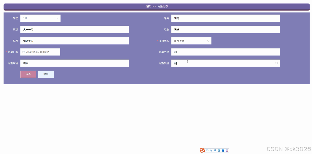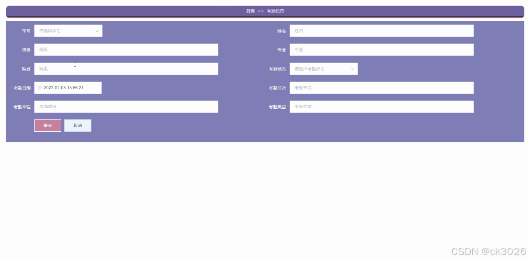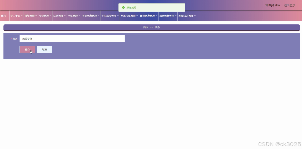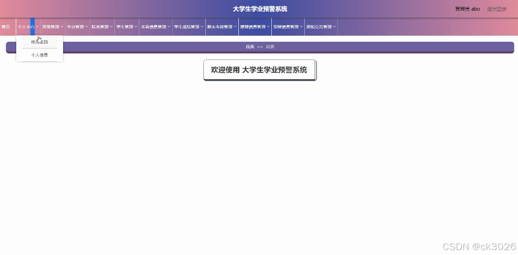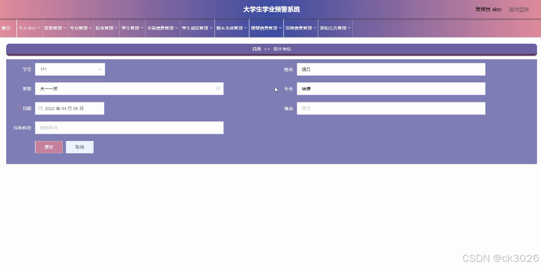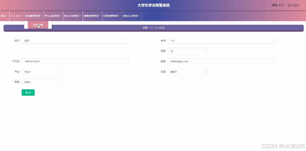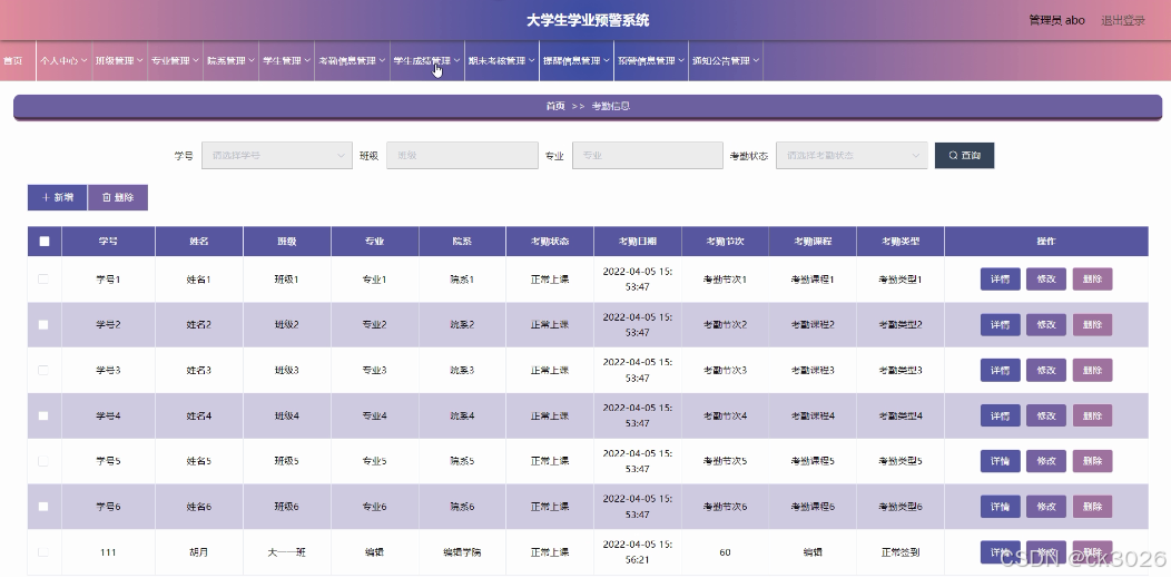 考勤信息,学生,学生成绩,班级,专业,院系,期末考核,提醒信息,预警信息,通知公告 |