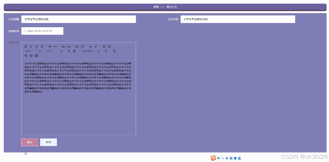 通知公告管理:系统提供通知公告发布功能,用于发布学业相关政策、学习资源推荐、学业辅导活动等信息,增强信息透明度,促进学生自主学习。
