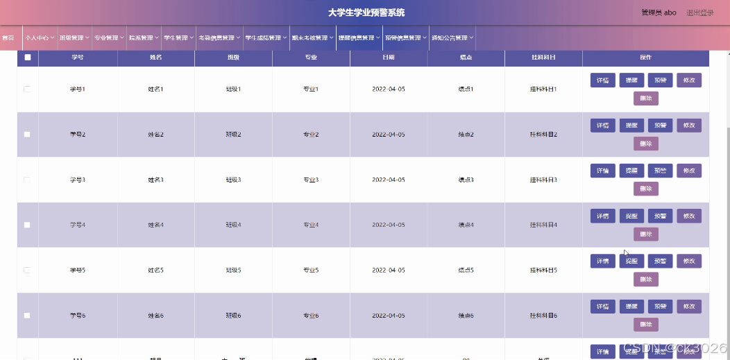 学业状态监测:基于整合的数据,系统将对每个学生的学业状态进行实时监测,包括出勤率、课程成绩、学分积点等关键指标。