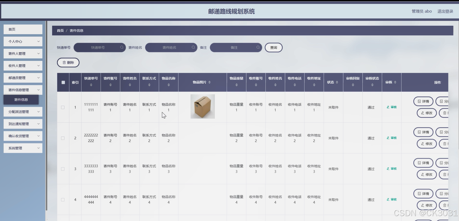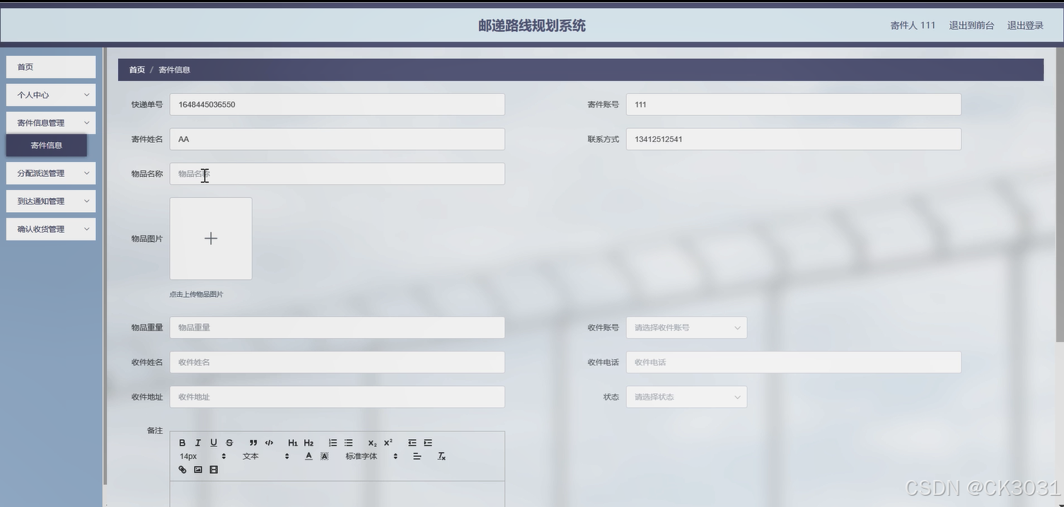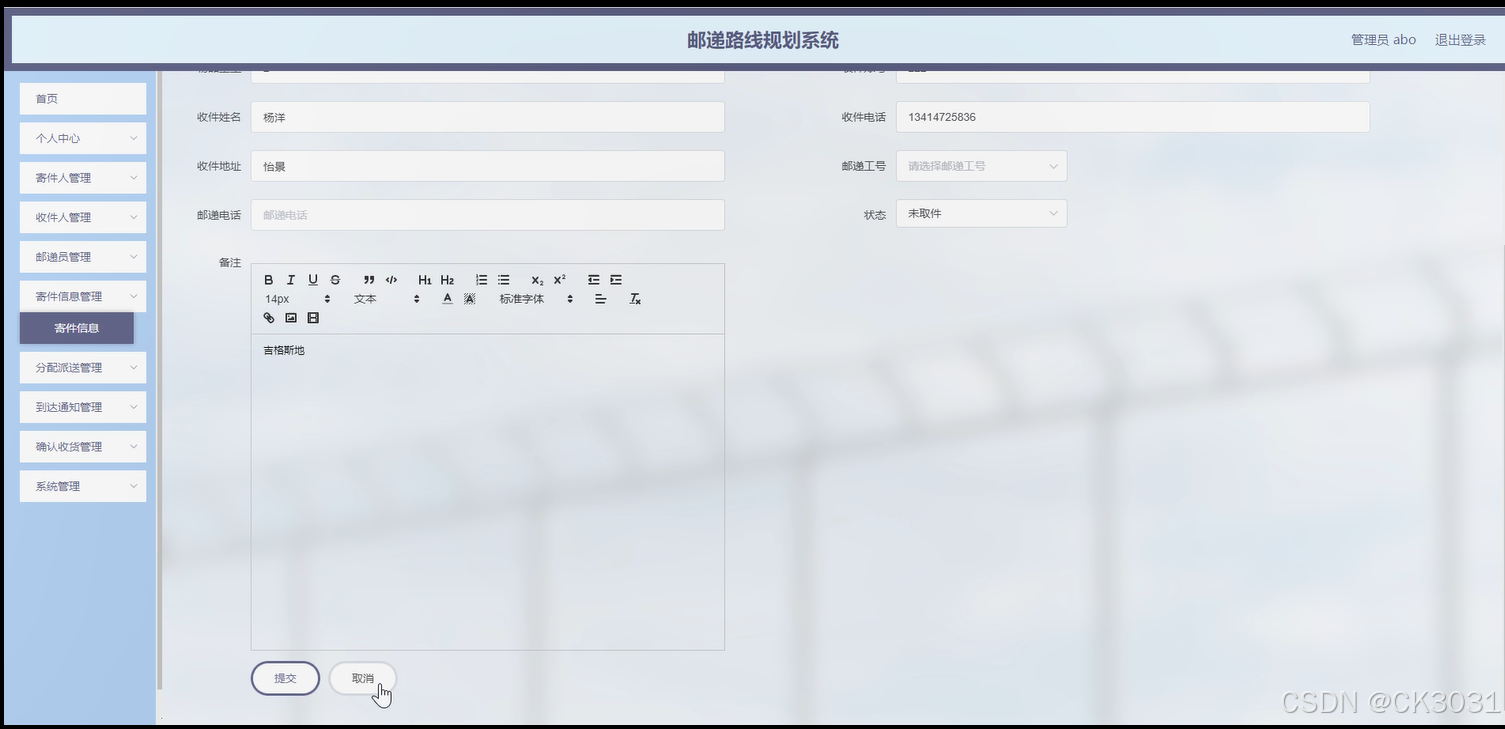 系统内容:寄件人,收件人,邮递员,寄件信息,分配派送,到达通知,确认收货