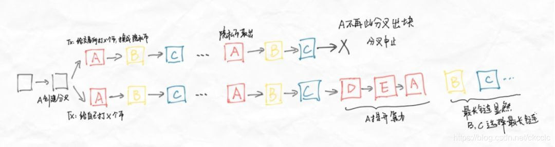 如下图所示,仍然是 A、B、C 三个出块节点,假如 A是攻击节点,它在产生分叉时创造两笔交易。一笔将X个币发给自己的一个钱包地址,同时在另外一个分叉上将X个币发到交易所。B、C出块节点因 Nothing At Stake 所以同时会在两条分叉链上出块。当交易被交易所确认后, A 将 X 个币出售兑换成隐私币种,移出交易所。之后 A 通过增加质押币量,或创建多个其他出块节点的方式提升出块权重,只在分叉链继续出块。此时最长链很明显,且逐渐拉开差距,会最终成为最长链,A 成功将 X 个币双花。