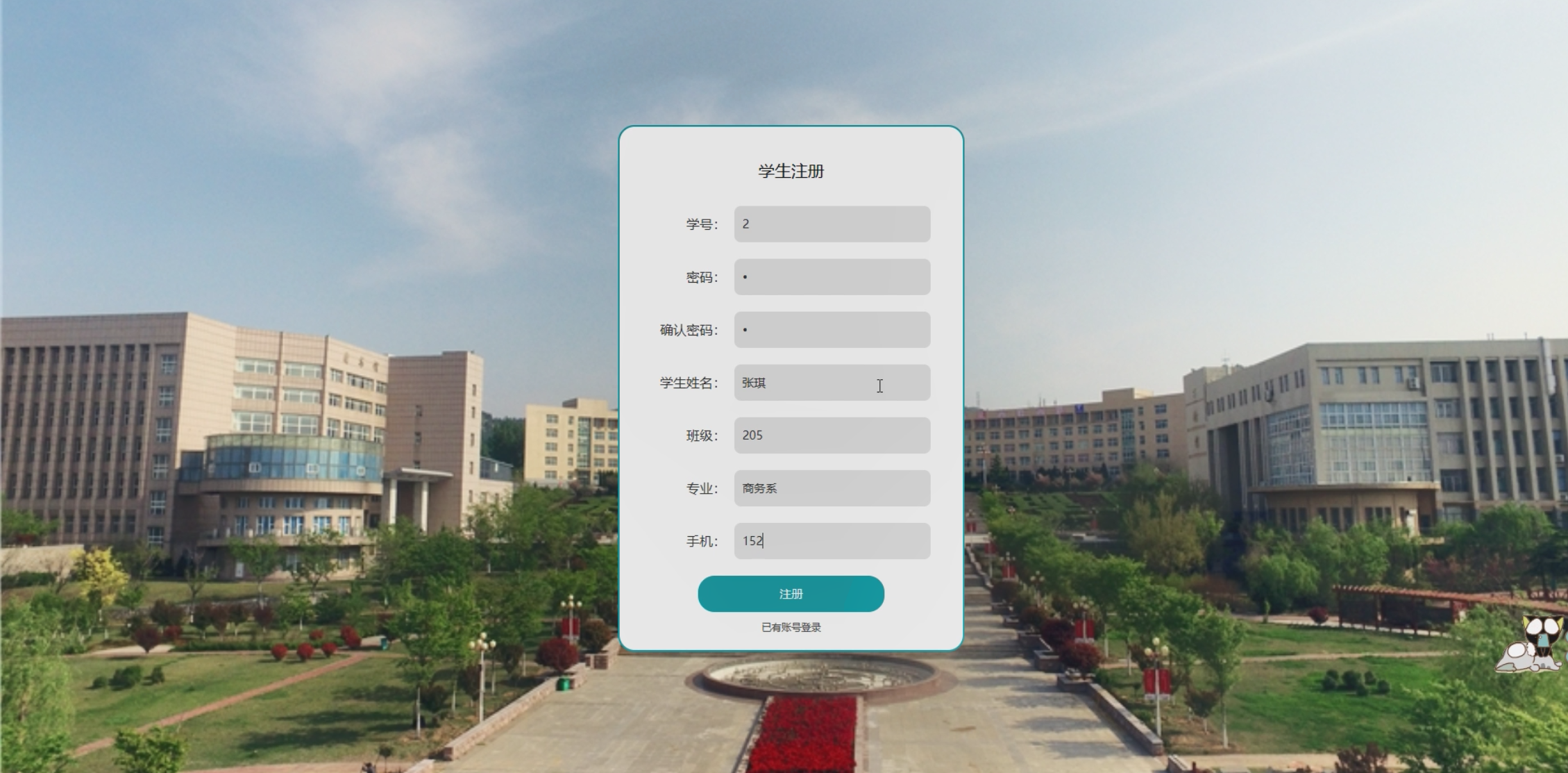 支持学生注册、登录及个人信息维护,包括学号、姓名、联系方式等。系统采用角色权限控制,确保数据安全性和隐私保护。