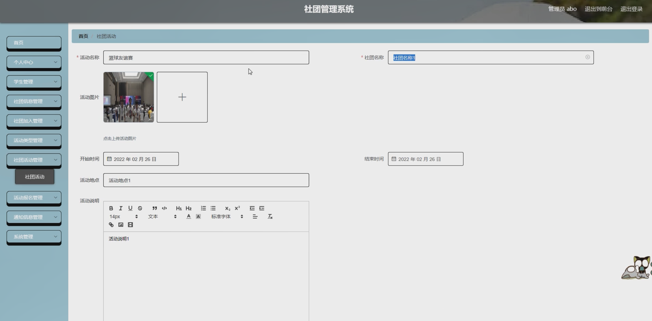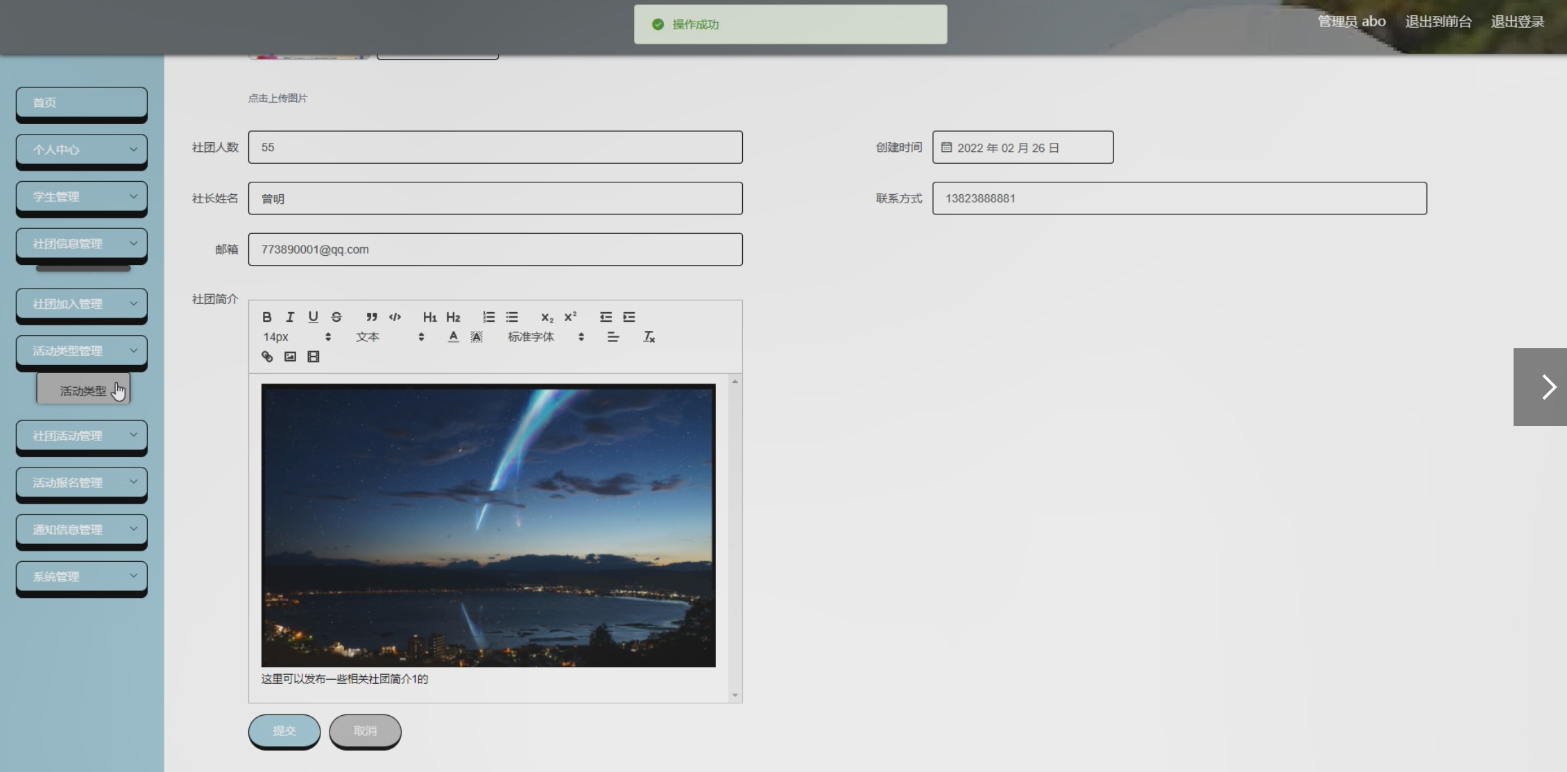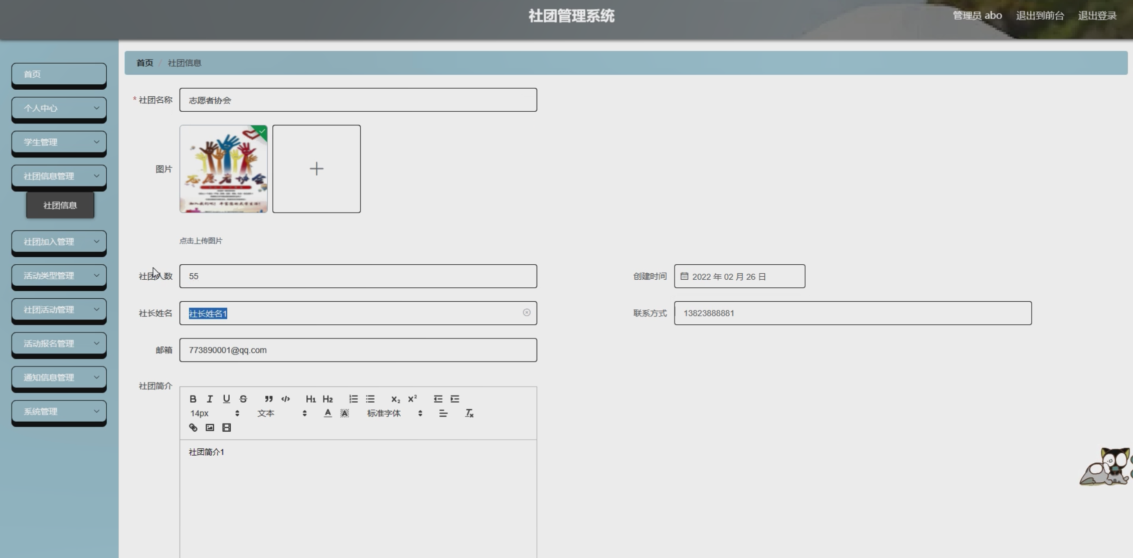 提供社团创建、信息编辑、成员管理等功能。社团负责人可通过后台更新社团简介、Logo、招新要求等内容,学生可一键查询所有社团详情。