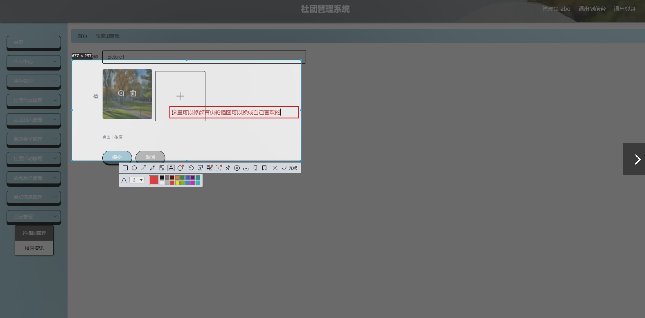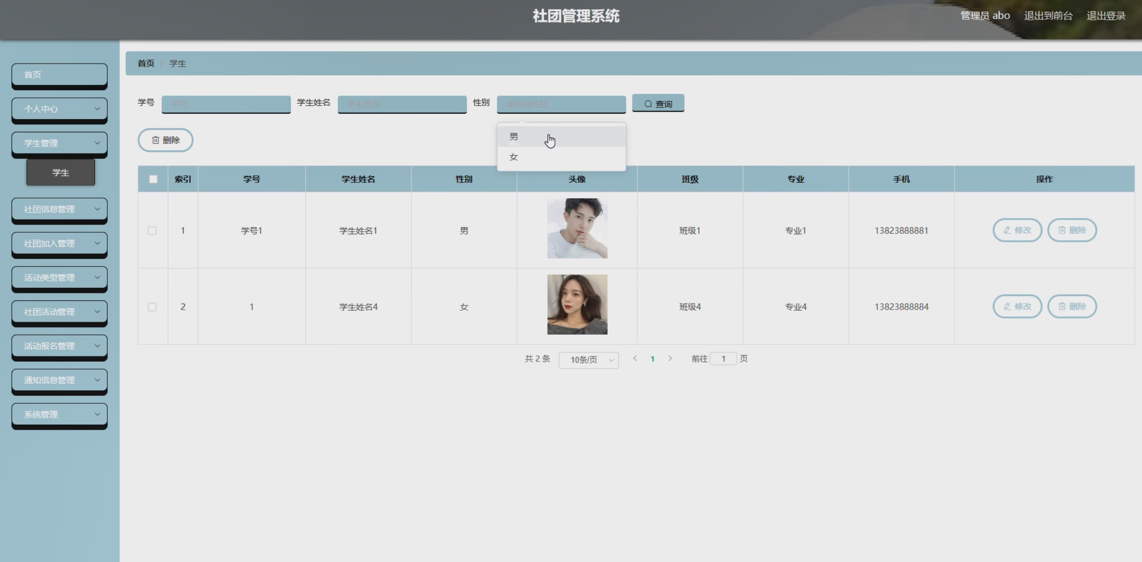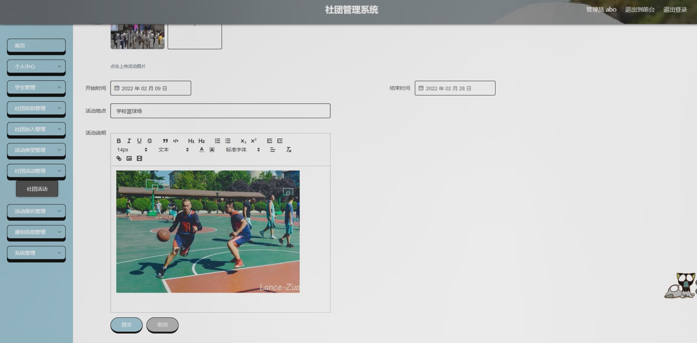 提供社团创建、信息编辑、成员管理等功能。社团负责人可通过后台更新社团简介、Logo、招新要求等内容,学生可一键查询所有社团详情。