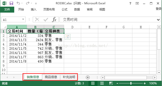 必须通过Sheet名读取表,一个Excel文件里面可能有多个sheet表,所以你要读取其中某张表,或者所有表,必须提前知道每张表的表名。如下图中的”销售信息”、”商品信息”、”补充说明”。此坑影响不大,并且用sqlTables可以查到表名,可以解决这个问题。