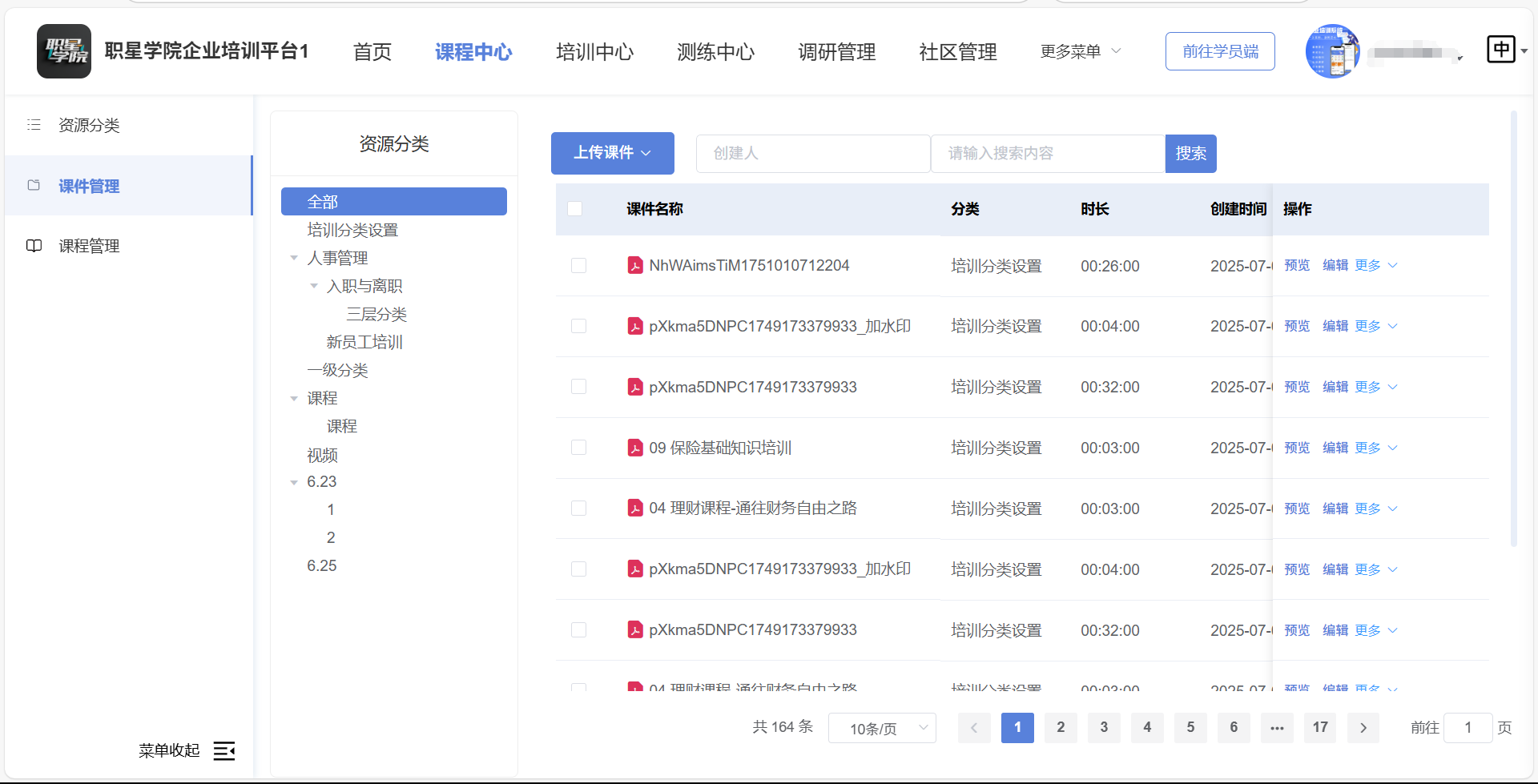 企业可将已有的课件、视频、图文内容一键上传至职星学院系统,快速构建自己的“知识库”。系统支持多种格式、多种组织方式(课程、专题、系列培训),帮助企业打造真正属于自己的“企业大学”。