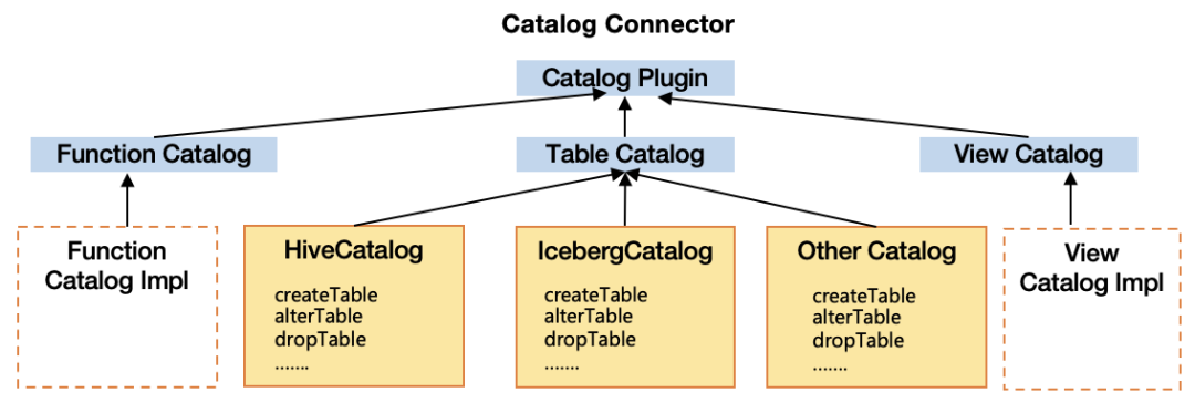 统一Catalog模型连接面对多种数据源元数据系统设计了统一的Catalog模型描述Hive元数据、文件系统元数据、消息队列Topic元数据、JDBC元数据、AI模型元数据等信息;为了让下面的数据源组件能识别统一Catalog模型,针对不同数据源提供了Catalog Connector连接器,兼容包括库表、函数、视图、ScanBuilder、WriterBuilder等接口实现。在这一层既实现了多种数据源元数据的统一管理,又可以支持下层数据源的快速联邦分析。