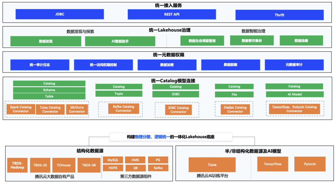 TBDS全新元数据湖系统按照分层主要有统一接入服务层、统一Lakehouse治理层、统一元数据权限层、统一Catalog模型连接层。我们引入了Gravitino并且基于它在数据治理、数据权限等能力上做了大量的TBDS已有能力的合入优化,形成一个闭环、完整的系统。